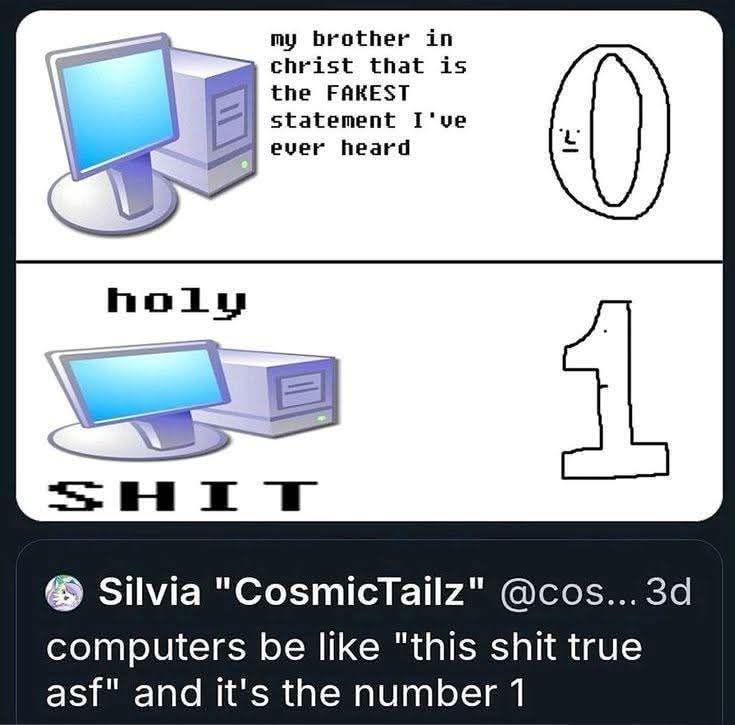 GASP! The AUDACITY of computers to just sit there and declare that the number 1 is TRUE! The sheer DRAMA of Boolean logic! 🤯 For the uninitiated souls, in programming, the number 1 is literally interpreted as TRUE while 0 is FALSE. So when a computer sees a 1, it's basically having an existential crisis screaming "HOLY SHIT THIS IS THE ABSOLUTE TRUTH OF THE UNIVERSE!" Meanwhile, programmers are just trying to check if a checkbox is clicked. THE THEATRICS!
