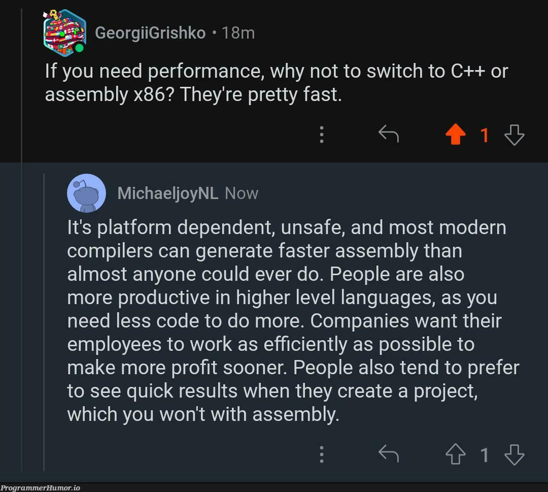 GeorgiiGrishko 18m If you need performance, why not to switch to C or assembly 86? They're pretty fast. 1 MichaelioNL Now It's platform dependent, unsafe, and most modern compilers can generate faster assembly than almost anyone could ever do. People are also more productive in higher level languages, as you need less code to do more. Companies want their employees to work as efficiently as possible to make more profit sooner. People also tend to prefer to see quick results when they create a project, which you won't with assembly.